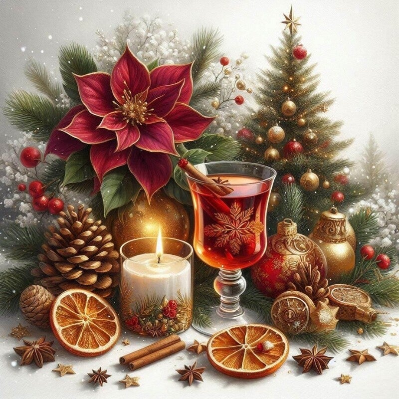 De kerstster straalt tussen de dennenappels, sinaasappelschijfjes, kaneelstokjes en steranijs, terwijl de kaars en het glas glühwein de koude winteravonden verwarmen.