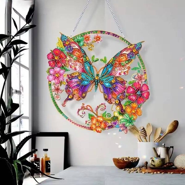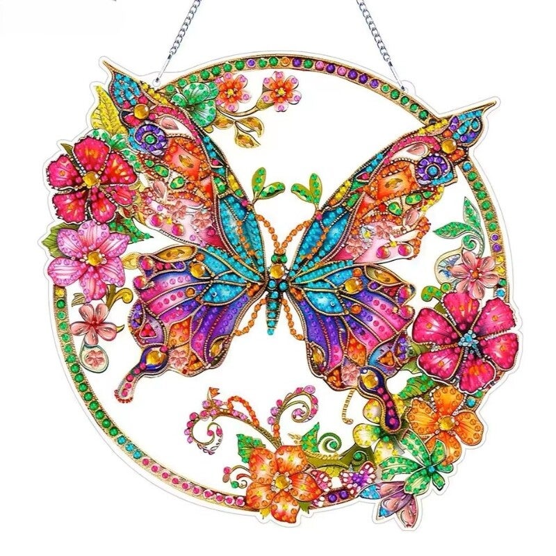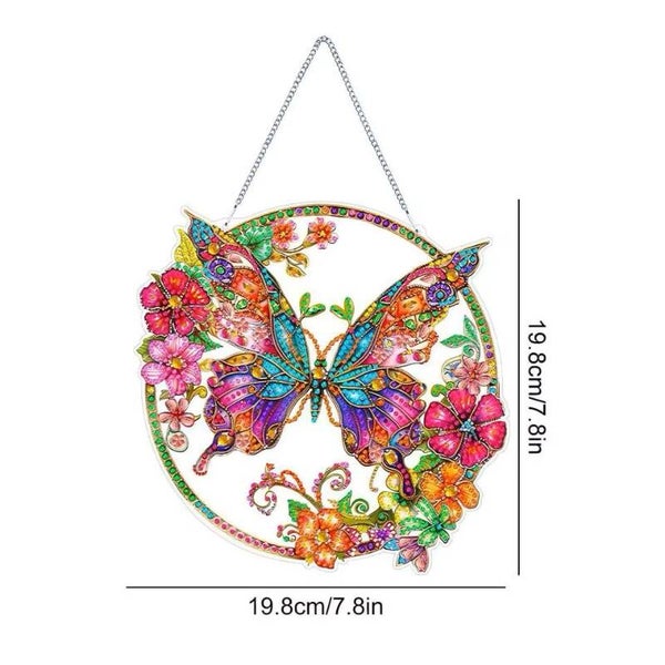Diamond Painting brengt plezier en sfeer in huis met deze vrolijke hanger in de vorm van een vlinder. Het ronde ontwerp laat een grote vlinder zien, omlijst door bloemen in verschillende kleuren. Samen vormen ze een rustig en vrolijk geheel dat meteen in het oog springt. Door het licht dat langs de steentjes speelt, geeft de hanger steeds weer een sprankelend effect. Deze Diamond Painting is eenvoudig op te hangen en past in de woonkamer, bij het raam of in een gezellige hoek.
