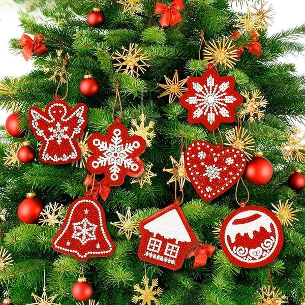 Diamond Painting brengt sfeer in je huis tijdens de feestdagen en maakt Kerst nog gezelliger. Deze set van 10 Kerstboomhangers is ideaal om je boom een warme en persoonlijke uitstraling te geven. De vrolijke vormen, zoals een ster, hart, huisje, engel en sneeuwvlok, zijn stuk voor stuk versierd met sprankelende details die meteen in het oog springen. Door de rood-witte kleurencombinatie passen ze perfect bij de traditionele kerstsfeer en maken ze je decoratie helemaal af.