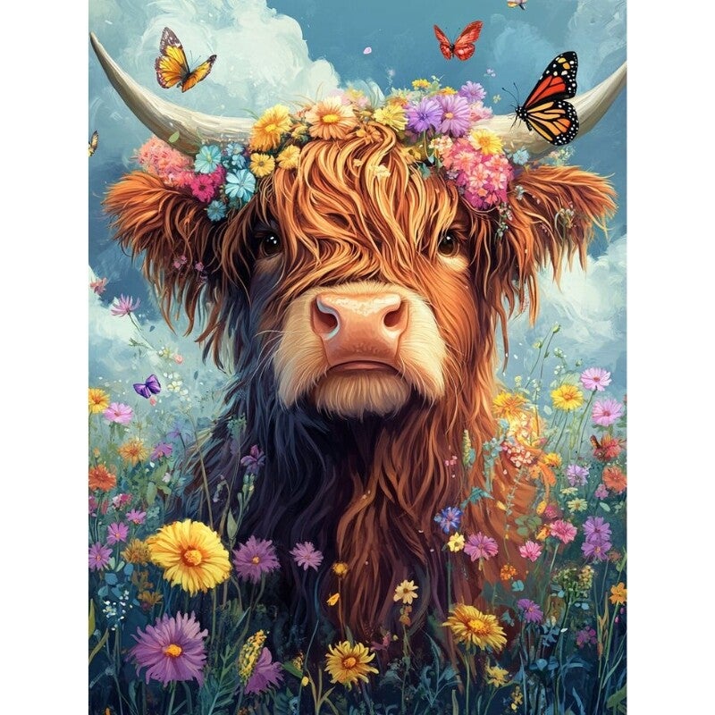De Schotse Hooglander met zijn wilde vacht en sierlijke bloemenkrans maakt deze Diamond Painting betoverend om te creëren.