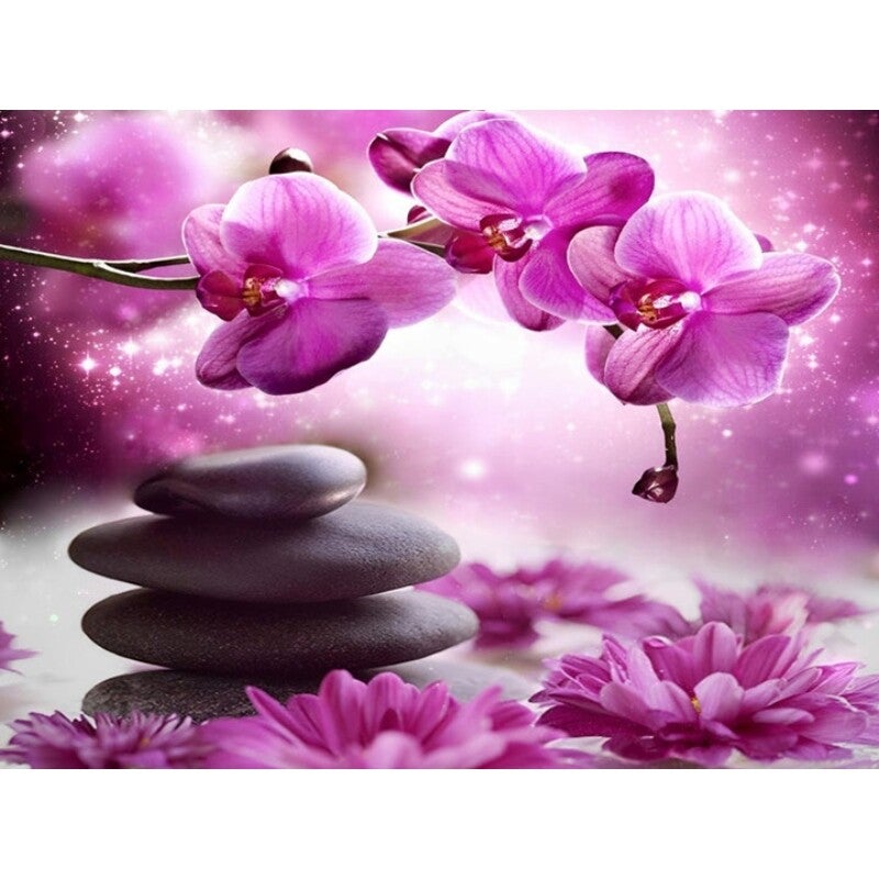 Diamond Painting van een prachtige paarse orchidee tegen een achtergrond vol magie en rust.